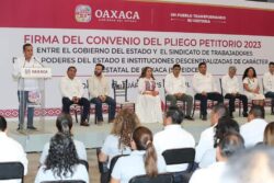 Oaxaca de Juárez, Oax., 25 de abril de 2023.- Teniendo como testigo de honor al gobernador del estado Salomón Jara Cruz, el secretario de Administración Antonino Morales Toledo y el secretario general del Sindicato de Trabajadores de los Poderes del Estado e Instituciones Descentralizadas de Carácter Estatal de Oaxaca, (STPEIDCEO), Pedro Castillejos Villalobos, firmaron el convenio del pliego petitorio 2023.