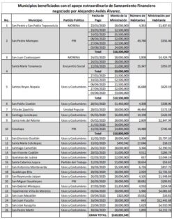 En la lista se detalla que 26 municipios de Oaxaca recibieron en los primeros seis meses de 2020, un total de 169 millones 820 mil pesos del Fondo de Saneamiento Financiero, de estos 19 son gobernador por Usos y Costumbres, 3 por el PRI, 2 por Morena, uno por Encuentro Social y otro por Unidad Popular.