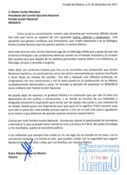 En una carta dirigida al presidente nacional del PAN, Marko Cortés, puntualiza que no está conforme con la actual dirigencia estatal y que no se siente representada, esto en pleno proceso electoral en donde de elegirá el relevo del Gobernador de Oaxaca Alejandro Murat Hinojosa.