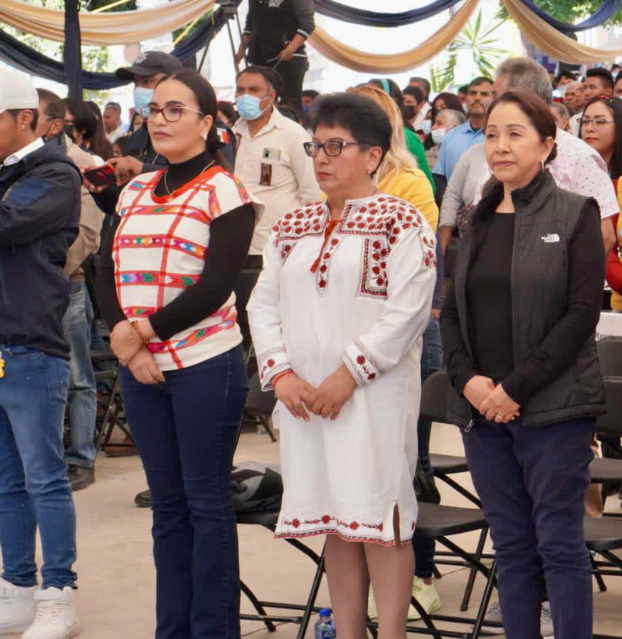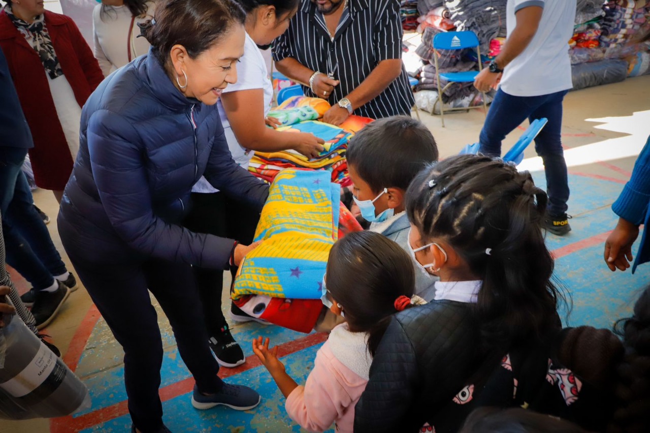 • Irma Bolaños Quijano, presidenta honoraria del DIF estatal, entregó cobijas, frazadas, suéteres, chamarras y bastones a pobladores de Tlaxiaco y Cuquila