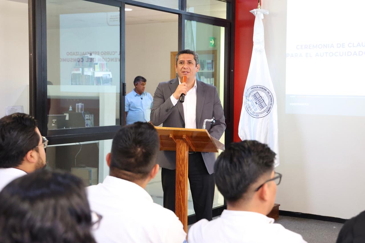 Oaxaca de Juárez a 18 de noviembre de 2025.- La Fiscalía General del Estado de Oaxaca genera los mecanismos institucionales para fortalecer que 167 personas servidoras públicas, garanticen su desempeño en los procesos de evaluación de control y confianza atendiendo a las recomendaciones realizadas por el Centro Estatal de Evaluación y Control de Confianza (C3), por medio del Curso Especializada para el Autocuidado y Prevención del Consumo de Sustancias Psicoactivas.