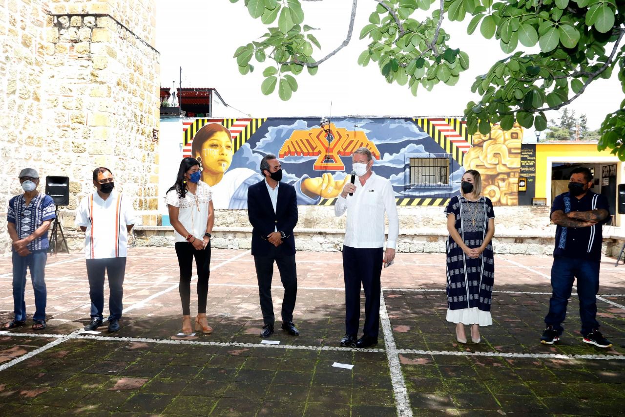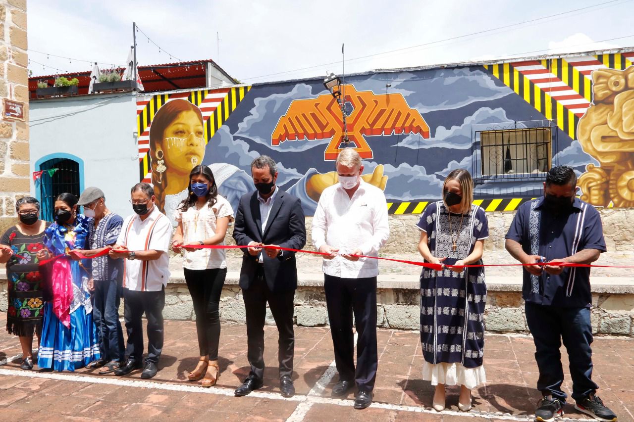 Además, contó con la presencia del Presidente del Comité de Vida Vecinal del Barrio de Jalatlaco, Arnel Cruz Salazar, el propietario de la vivienda que alberga el mural, Juan Alejandro López Soto y el artista Dario Canúl, representante de Tlacolulokos.