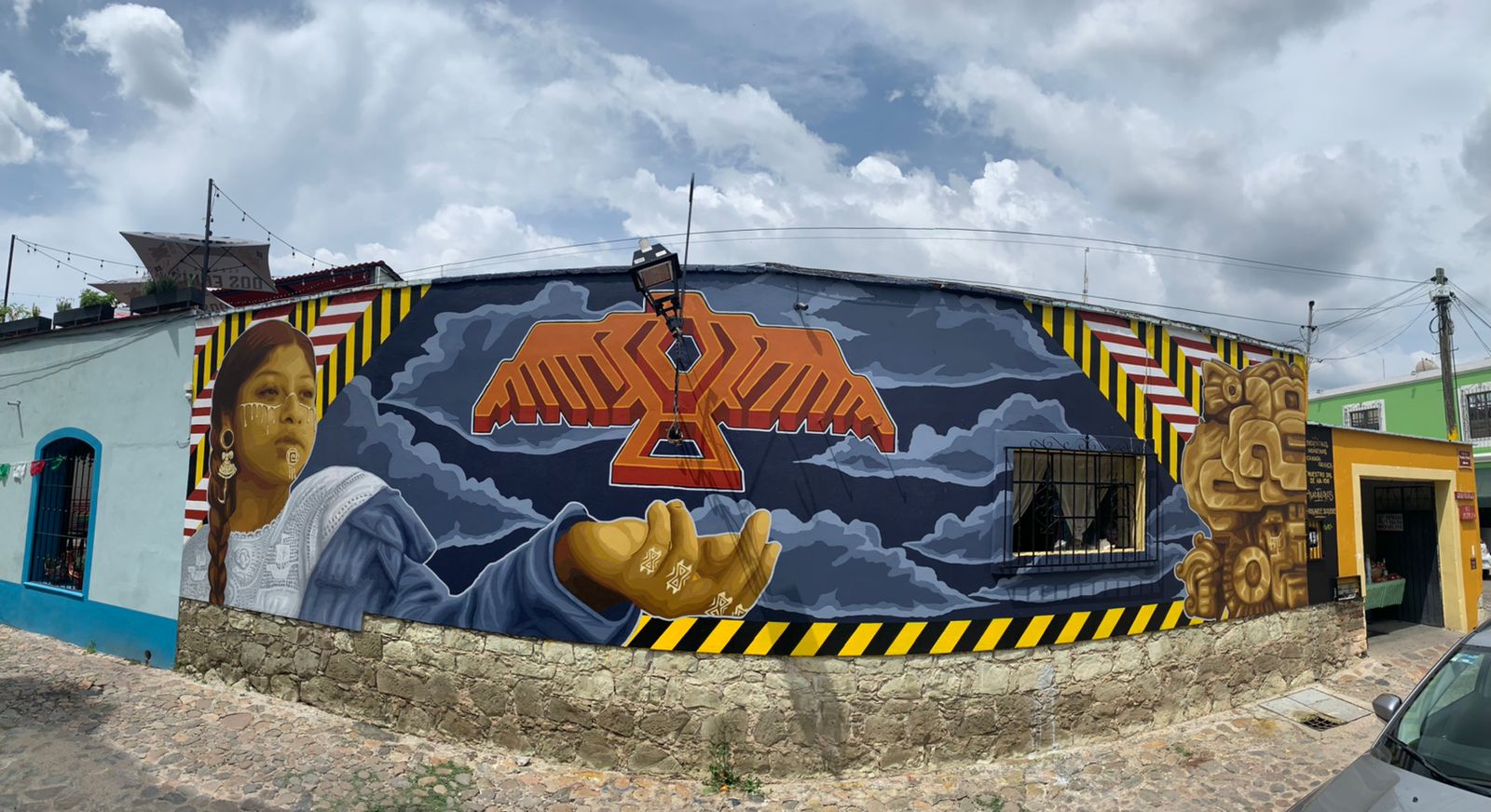 Este medio día, se realizó la inauguración del mural “Nuestro sol se ha ido”, realizado en conjunto entre los artistas Rolande Souliere del pueblo originario canadiense “anishinaabe” y el colectivo zapoteco de los Valles Centrales de Oaxaca, Tlacolulokos, como parte de las actividades de Encuentros Indígenas Canadá – Oaxaca 2021.
