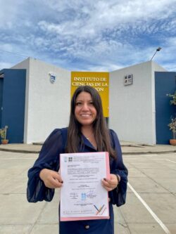 Ella, fue la primera titulada de la primera generación de la Licenciatura en Psicología que oferta el Instituto de Ciencias de la Educación de la Universidad Autónoma “Benito Juárez” de Oaxaca (ICE UABJO), y lo hizo obteniendo Mención honorífica por su Excelente Trayectoria al mantener un promedio de 9.7 en toda su carrera.